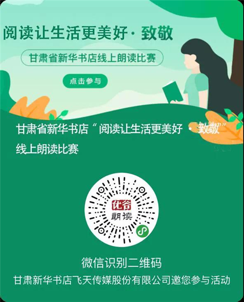 讀者進(jìn)入“甘肅新華書店飛天傳媒”公眾號(hào)點(diǎn)擊“新華朗讀”進(jìn)入小程序后,點(diǎn)擊頂部的“閱讀讓生活更美好?致敬”活動(dòng)圖,進(jìn)入活動(dòng)專區(qū),即可參加朗讀。