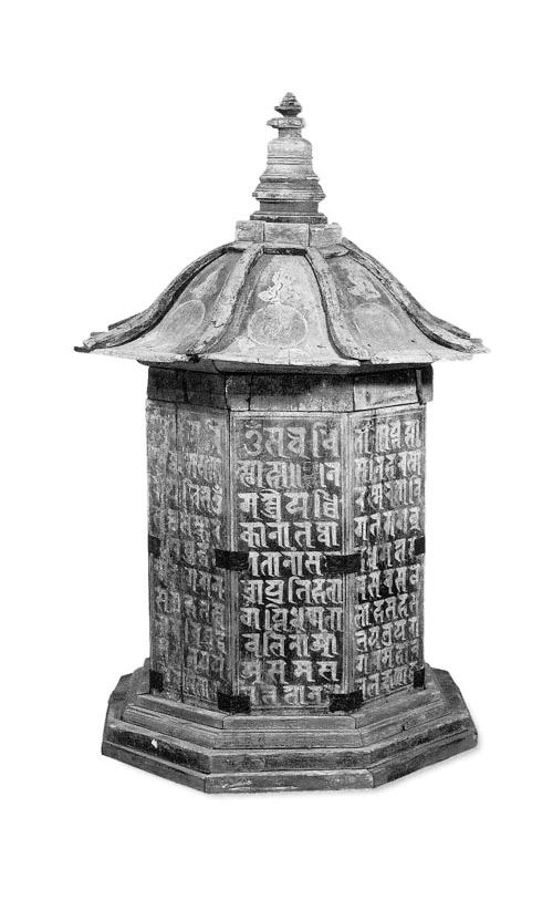 西夏木緣塔為西夏墓葬中第一次發(fā)現(xiàn)的西夏葬器。該塔通高75厘米,塔頂邊沿寬47厘米,呈四層八角形,飾紅色;分塔座、塔身、塔頂和塔剎四部分。塔座為四級(jí)八邊臺(tái)階。塔身為八邊柱體形,由長(zhǎng)34厘米、寬12.5厘米、厚2厘米的八塊木板合成,表面涂藍(lán)色,每邊有黃色工整梵文“陀羅尼”,并用漢文注明陀羅尼經(jīng)名。塔頂為傘式八邊形,每邊彩繪云氣紋和一個(gè)梵文字,內(nèi)有墨書(shū)“故考任西經(jīng)略司都案劉德仁,壽六旬有八,于天慶五年歲次戊午四月十六日亡歿,至天慶七年歲次庚辰(申)口夏十五日建緣塔,至中秋十三日入課訖”。塔剎圍欄為八邊形,其他相輪、覆缽、剎頂都是圓形,由下向上收分;底座周?chē)L有卷草紋。