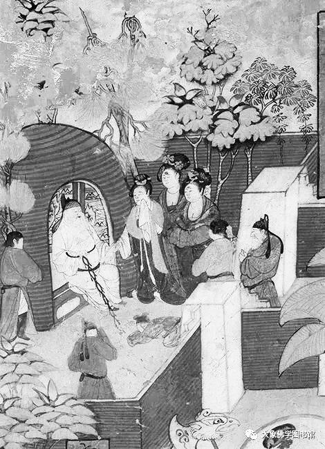 榆林窟第25窟《老人入墓圖》中,老人頭戴透額羅帽,著圓領白袍服,足蹬軟鞋,拄鏤空杖,安詳?shù)刈谀勾采?,床前有弧門裝飾,墓內掛山水屏風畫。老人與親屬執(zhí)手告別,親屬八人均痛苦不堪,或用巾拭淚,或以袖掩面,或趴地叩拜。