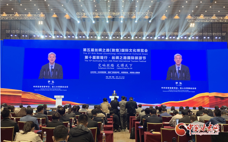 中國(guó)甘肅網(wǎng)9月24日訊(本網(wǎng)記者  宋芳科 楊亞楠 張振國(guó))9月24日上午,第五屆絲綢之路(敦煌)國(guó)際文化博覽會(huì)和第十屆敦煌行·絲綢之路國(guó)際旅游節(jié)開幕。本屆“一會(huì)一節(jié)”由文化和旅游部、國(guó)家廣播電視總局、中國(guó)國(guó)際貿(mào)易促進(jìn)委員會(huì)、甘肅省人民政府共同主辦,以“交響絲路 文博天下”為主題,旨在進(jìn)一步加強(qiáng)“一帶一路”人文交流的官方合作和民間往來,增進(jìn)共建“一帶一路”國(guó)家的文化認(rèn)同。中共中央政治局委員、中央書記處書記、中宣部部長(zhǎng)黃坤明以視頻方式發(fā)表主旨演講。