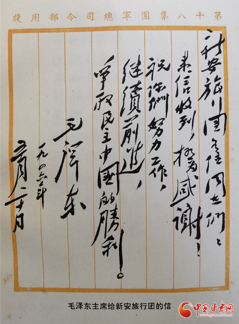 1946年5月20日,毛澤東主席給新旅回信:“新安旅行團各位同志們:來信收到,極為感謝!祝你們努力工作,繼續(xù)前進,爭取民主中國的勝利。”時隔75年后的2021年5月30日,習近平總書記給新安小學的少先隊員們回信:“當年,在黨的關懷和領導下,‘新安旅行團’不怕艱苦,足跡遍及大半個中國,以文藝為武器,喚起民眾抗日救亡,宣傳黨的主張,展現了愛國奮進的精神風貌。希望你們結合自身成長實際學好黨史,以英雄模范人物為榜樣,從小堅定聽黨話、跟黨走的決心,刻苦學習,樹立理想,砥礪品格,增長本領,努力實現德智體美勞全面發(fā)展。”