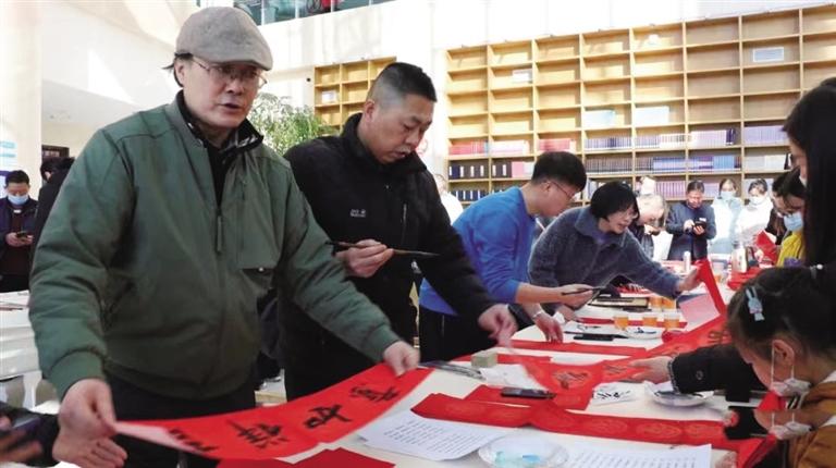 活動(dòng)中,蘭州畫院和市文化館的10余位書畫家提筆蘸墨、盡情揮毫,為新區(qū)圖書館精心創(chuàng)作了美術(shù)作品,并為聞?dòng)嵹s來的眾多新區(qū)居民現(xiàn)場(chǎng)書寫了寓意吉祥的春聯(lián)和“福”字近400套(幅),在春節(jié)來臨之際為他們送上了美好的祝愿。