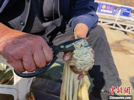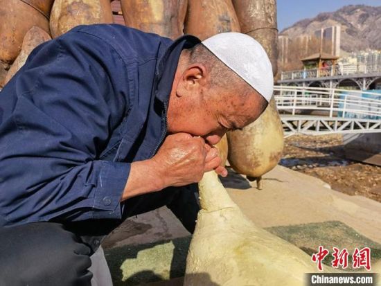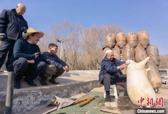 2月24日,春日暖陽下,今年70多歲的省級羊皮筏子非遺傳承人張德寶在蘭州黃河邊制作羊皮筏子,為迎接旅游旺季到來提前做好準(zhǔn)備。劉玉桃 攝
