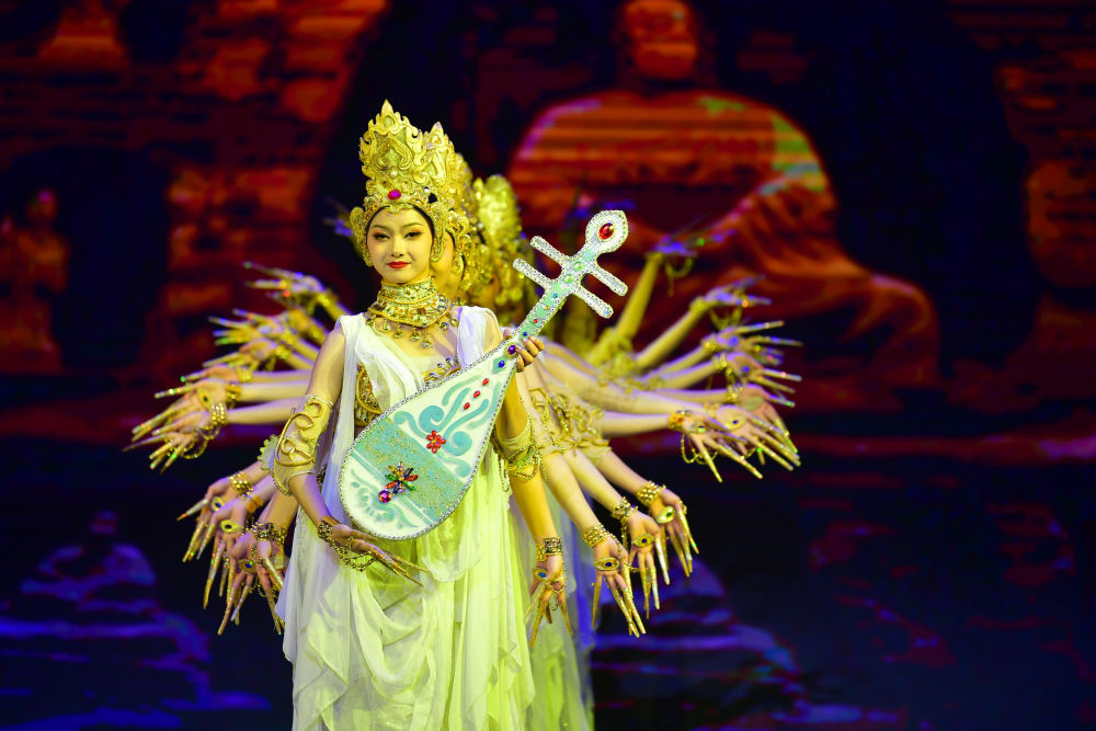 2021年9月24日,第五屆絲綢之路(敦煌)國際文化博覽會和第十屆敦煌行·絲綢之路國際旅游節(jié)在甘肅省敦煌市開幕。圖片為演員在開幕式上演出。新華社記者陳斌 攝