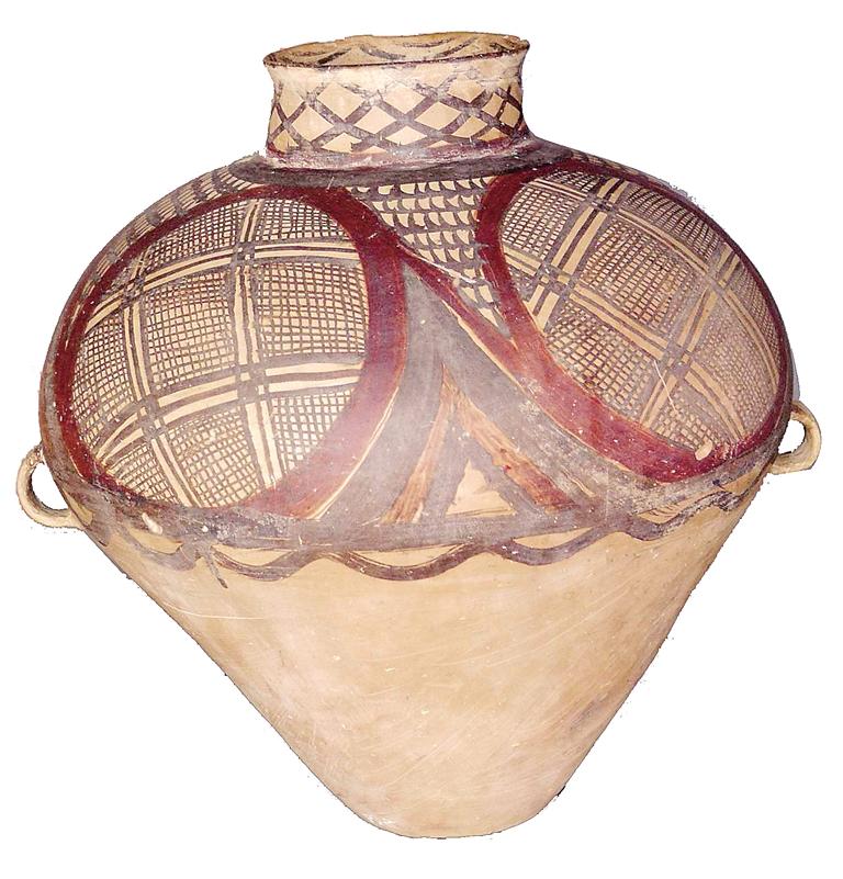 姓名:馬家窯文化馬家窯類型水波紋彩陶盆 出生年代:距今約5400-4850年左右 住址:臨夏州博物館 體型:高10.5厘米,口徑28厘米,底徑10.5厘米 自我描述: 我是國(guó)家一級(jí)文物。1976年出土于積石山縣銀川鄉(xiāng)水陳村大坪遺址。泥質(zhì)橙黃陶,大口,斜平沿,圓腹,平底;口沿上均勻分布有12個(gè)圓點(diǎn)紋,其間以多條斜線相隔;盆底內(nèi)壁底部繪數(shù)周同心圓紋,圓心內(nèi)繪數(shù)條星斗紋,口沿至同心圓之間的內(nèi)壁上,繪有主題紋飾水波紋;外壁繪一周變體鳥紋,其間以圓點(diǎn)紋相間。