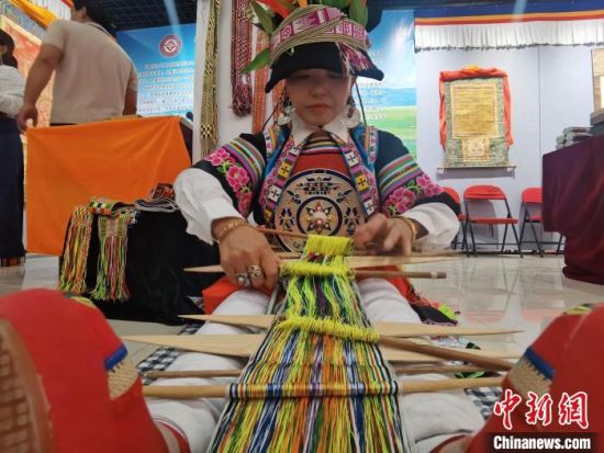 中新網(wǎng)甘肅張掖6月8日電 (閆姣)腳蹬紡織板,手持木梭子,甘肅甘南藏族自治州舟曲縣藏族姑娘全庸卓瑪坐在地上,展示省級非遺織錦帶,藏族婦女用其束腰、扎靴。她說,這項技藝后繼乏人,希望通過這種“走出去”的活動,讓更多人了解這一獨特文化。