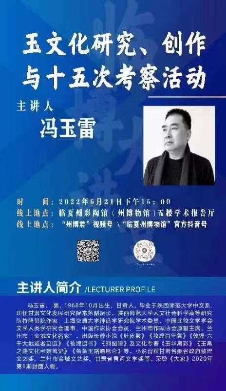 為認真貫徹落實省第十四次黨代會精神,進一步弘揚中國玉文化和民族精神,推動玉文化傳承及玉文化文創(chuàng)產(chǎn)業(yè)發(fā)展。6月21日下午,甘肅文化發(fā)展研究院常務副院長馮玉雷受邀在臨夏州彩陶館(州博物館)學術報告廳作了題為《玉文化研究、創(chuàng)作與十五次考察活動》的學術講座。