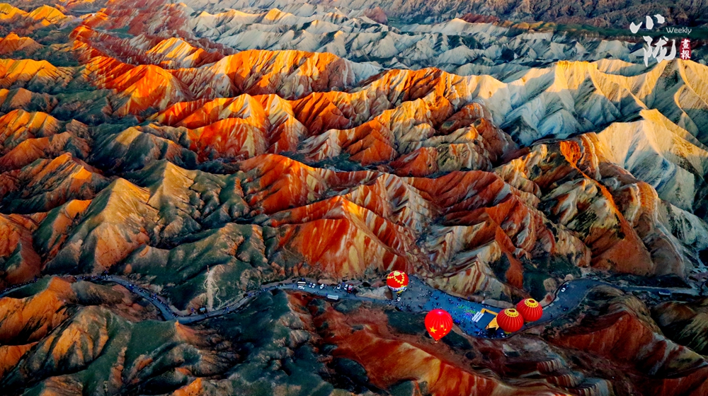 丹霞四季皆勝景,丹霞紅白相間的線條滑過橢圓形丘陵,宛如少女七彩裙擺處的流蘇,隨風(fēng)搖曳,風(fēng)情萬種。遠(yuǎn)方低矮的彩色丘陵層層疊起,千姿百態(tài),雄渾壯麗,如隱藏在山谷中的萬千疑兵,引人無限遐想。