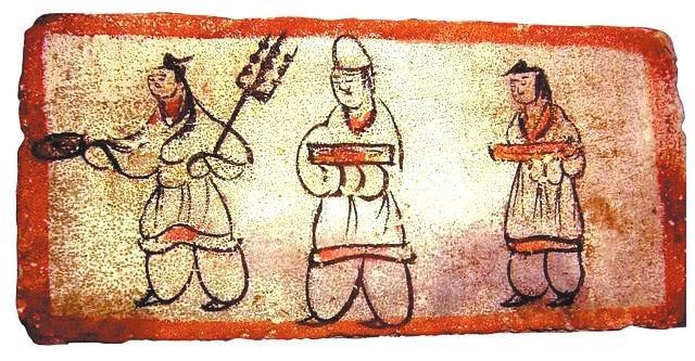 河西麥制的面食是一絕,在那時(shí)也是河西居民的主食,人們能用它做出品類繁多的面點(diǎn)。豐富的舌尖體驗(yàn),來自于湯餅和蒸餅。在壁畫磚中,有侍女們?cè)诖蟾字泻兔娴膱?chǎng)景。
