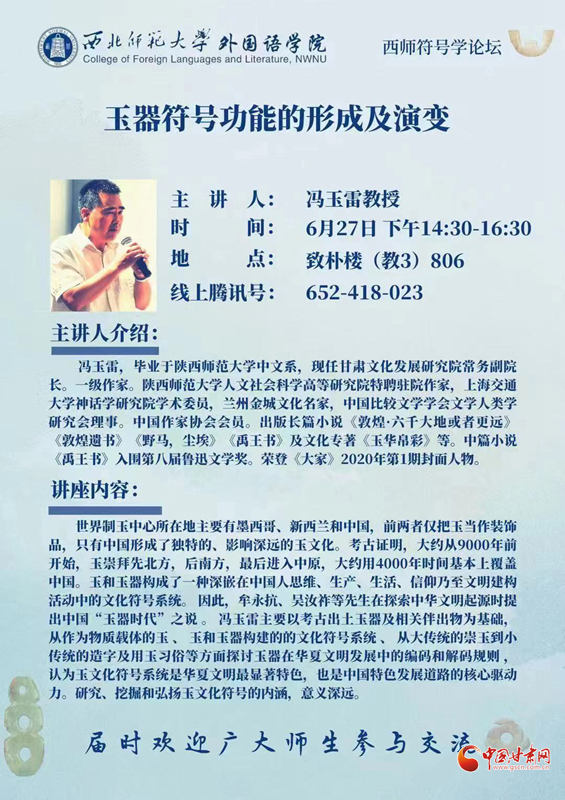 中國(guó)甘肅網(wǎng)7月3日訊 6月27日下午,甘肅文化發(fā)展研究院常務(wù)副院長(zhǎng)、一級(jí)作家馮玉雷應(yīng)邀在西北師范大學(xué)外國(guó)語(yǔ)學(xué)院作了題為“玉器符號(hào)功能的形成及演變”的學(xué)術(shù)講座。