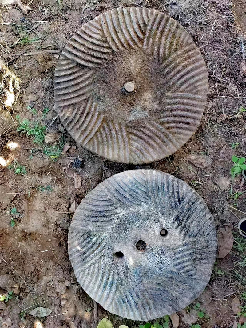 鑿石磨,其實也就是礪紋利齒。首先,將上扇抬起來放在地上鑿,下扇是固定在磨盤上面的,搬一條高凳子坐在上面鑿。上下兩扇的磨齒排列有序,互相對稱咬合,呈扇狀向四周延伸,極其科學(xué)合理。石匠就是把這些變鈍了的磨齒一錘一纖鑿鋒利。