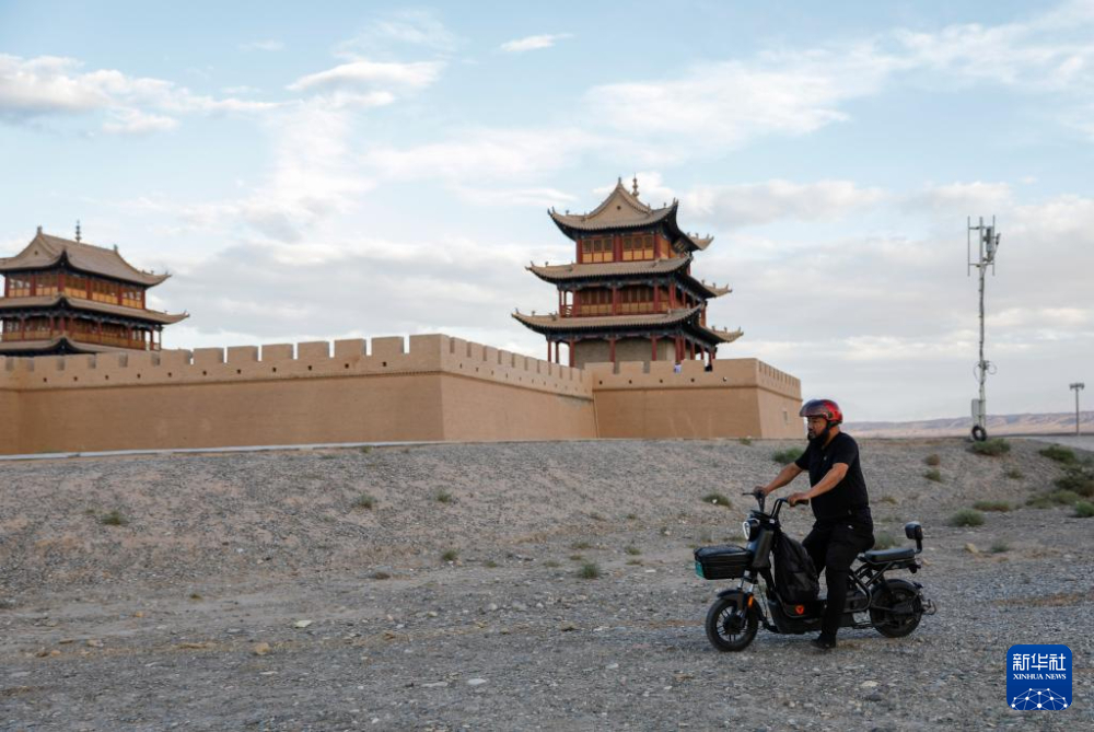 7月13日,李森結(jié)束一天的工作離開甘肅嘉峪關(guān)關(guān)城景區(qū)騎電動(dòng)車回家。新華社記者 方欣 攝