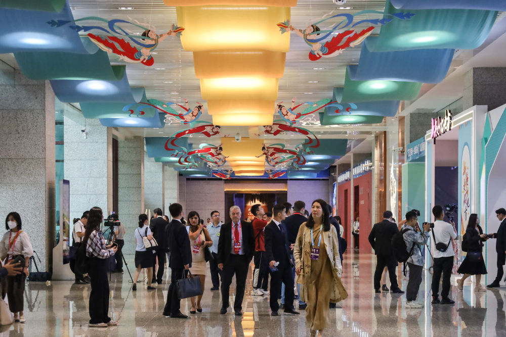 2023年9月6日,與會(huì)嘉賓在第六屆絲綢之路(敦煌)國(guó)際文化博覽會(huì)上參觀。新華社記者 馬希平 攝