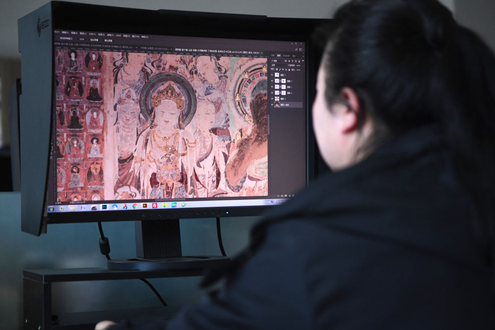 敦煌研究院文物數(shù)字化保護(hù)團(tuán)隊(duì)圖像處理人員年海麗在拼接壁畫圖像(2023年4月25日攝)。新華社記者 陳斌 攝