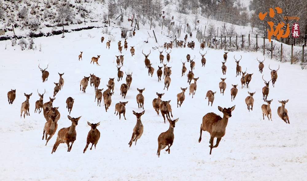 雪滿山川,素白沉靜。關(guān)灘溝鹿場的梅花鹿,在躲了一夜的風雪后成群結(jié)隊出來,或是雪中覓食,或是雪中撒歡,它們活潑的嬉戲好一幅祥和畫面。