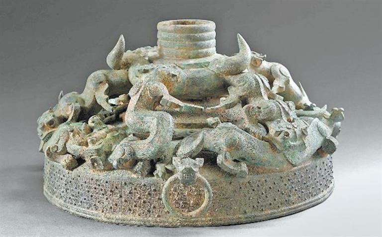 中國(guó)國(guó)家博物館收藏的秦公簋,1921年甘肅天水出土,簋呈圓形,蓋與器身相合成一略扁而圓的形體,蓋頂有圓形捉手,蓋邊緣及器口下飾勾連形蟠螭紋。蟠螭紋又稱交龍紋,流行于春秋中晚期至戰(zhàn)國(guó)早期,有一種由兩條或兩條以上小龍相交,組成紋飾單元,密布于器物表面。