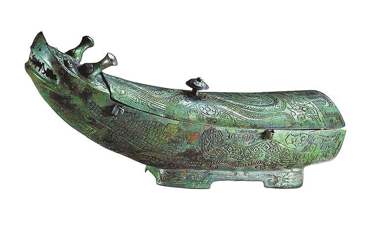 陜西寶雞出土的逨盉,酷似現(xiàn)代的扁圓形壺,器身呈扁圓形,長(zhǎng)方形口上有鳳鳥形蓋。鳳鳥引首高昂,喙微卷曲,振翼欲飛。器身與蓋用虎形鏈及雙環(huán)相連,虎作向上爬行狀,頭左偏而尾上卷。直管狀流,流端作龍首狀。鋬呈龍首向下噴水狀,下有四獸足。腹部?jī)蓚?cè)紋飾相同,分別由三圈組成,由外向內(nèi)依次為變體夔龍紋、重環(huán)紋和蟠龍紋。逨盉是祭祀禮器,它將天上飛的鳳鳥、地上跑的猛虎、水里游的蛟龍,作為溝通天地、人神的使者,使天地人三者合而為一。由于周人將動(dòng)物視為具有無(wú)限神力之神靈,因此青銅器上之動(dòng)物紋樣,除宗教祭祀意涵外,也富有一定的政治意義。貴族通過(guò)青銅器上神秘肅穆的動(dòng)物紋樣,令人望之崇敬生畏,以威嚇被統(tǒng)治者,達(dá)到鞏固本身地位及權(quán)威之目的,同時(shí)也含有龍騰虎躍鳳呈祥的美好寓意。