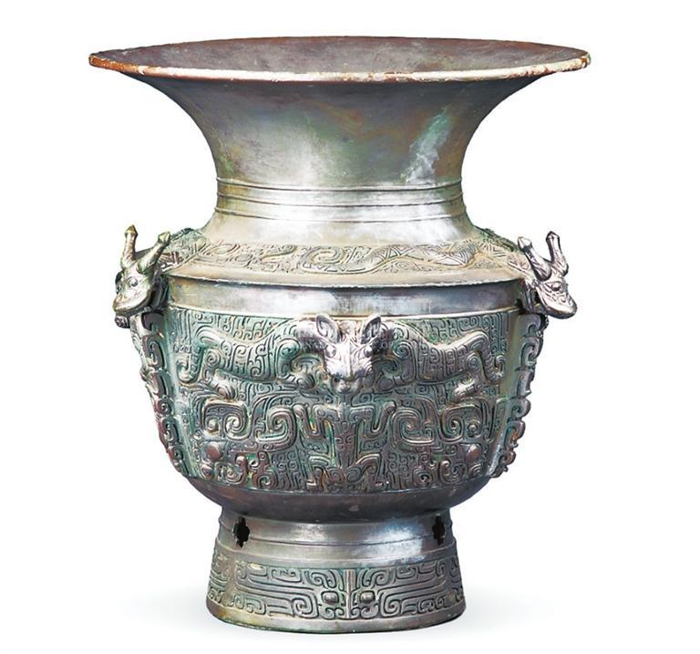 中國(guó)國(guó)家博物館收藏的龍虎紋青銅尊,高50.5厘米,重26.2千克,為一件體形較高大的盛酒器。青銅尊肩部以圓雕和浮雕相結(jié)合,塑造3條生動(dòng)的蟠龍形象,龍身蜿蜒,龍首探出,額有雙角,闊吻巨口,兩眼大睜。腹部紋飾為一個(gè)虎頭兩個(gè)虎身,虎口之下有一人形,人頭銜于虎口之中?;⑸硐路揭造槔鉃榻纾梼少琮埾鄬?duì)組成的獸面。從主體花紋看,龍、虎、人造型莊嚴(yán)穩(wěn)重、奇特神秘,特別是龍頭和虎頭用澆鑄法從外壁突兀凸起,雄健粗獷,比起用高浮雕法更具有一種威武逼人的悍氣。龍虎尊圓形大口表示上天,肩部神龍游蕩于空中;猛虎張牙舞爪守護(hù)大地。龍虎尊的鑄造采用十八塊母范經(jīng)兩次焊接而成,渾然一體,毫無(wú)痕跡。整器工藝精湛,花紋線條洗練,是商代青銅器中的精品。