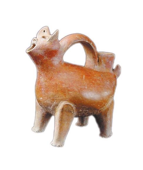 紅陶獸形壺,高21.6厘米,夾砂紅陶,通體磨光,遍施紅色陶衣,光潤(rùn)亮澤。器型圓面聳耳,拱鼻,張口,耳穿小孔,四肢粗壯,短尾上翹,背裝弧形提手,尾根部一筒形注水口,嘴可往外倒水,腹部鼓起加大了容積,四足立起可供加熱,使用方便,造型生動(dòng)美觀,集實(shí)用與仿生藝術(shù)于一身,是大汶口文化獨(dú)有的器形,充滿(mǎn)了創(chuàng)造性的靈感,是新石器時(shí)代一件難得的陶器珍品。