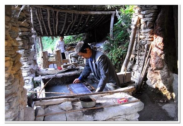 多少年來(lái),大堡一帶的紙匠們一直使用這種原始、簡(jiǎn)單的工具,遵照蔡倫發(fā)明的造紙工藝流程,制造出純天然的構(gòu)樹(shù)皮紙。