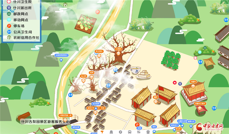 由于百年古梨園位于村落之間,占地面積大且道路蜿蜒曲折,許多外地游客在這里總會因為路況不熟或者看不懂紙質地圖而走很多冤枉路。針對游客的這一痛點,中國移動甘肅公司蘭州分公司依托云網(wǎng)融合和數(shù)字化服務優(yōu)勢,為什川梨園及周邊景區(qū)量身打造了5G+VR手繪地圖智慧導覽服務,根據(jù)當?shù)仫L格特色定制手繪地圖,展示當?shù)鼐包c及場所地標名稱,并可結合語音講解充分展現(xiàn)歷史背景、文物故事、人物典故等景區(qū)相關信息,真正讓每一位游客感受到“一部手機游梨園”的便利。