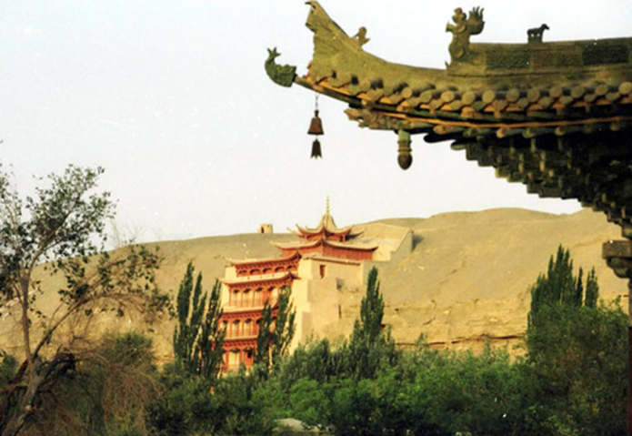 從20世紀70年代末開始,大量先進科技不斷被引入敦煌石窟保護。新技術、新材料、新手段的不斷運用,豐富了敦煌遺產(chǎn)的保護技術和保護手段,有效改變了石窟內(nèi)部及其環(huán)境的保護狀況,使敦煌遺產(chǎn)的保護工作從原來的搶救性保護,過渡到了科學保護階段。圖為透過敦煌莫高窟前的牌樓一角望去,敦煌莫高窟標志性建筑九層樓依舊雄偉壯觀。新華社記者梁強攝(2004年10月25日發(fā))