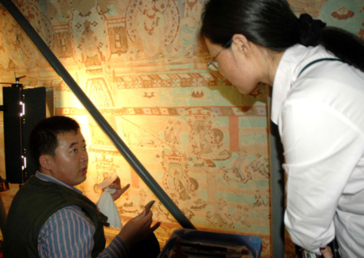 為了讓游客了解世界文化遺產(chǎn)敦煌莫高窟的壁畫保存現(xiàn)狀、保護原則、保護方式,提高公眾對莫高窟文物的保護意識,2008年6月以來,敦煌莫高窟壁畫保護修復現(xiàn)場每周定期向游客開放。圖為2008年9月22日,在莫高窟98窟內(nèi),敦煌研究院保護人員(左)正在向一名游客講解如何修復壁畫。新華社記者王艷明攝