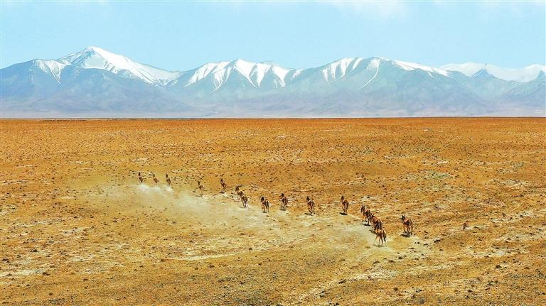 夏日的甘肅鹽池灣國家級自然保護區(qū)雪山巍峨,景色壯美。一群藏野驢時而追逐奔馳,時而悠閑覓食;大批北歸遷徙的候鳥自由翱翔,盡顯大自然的和諧之美。