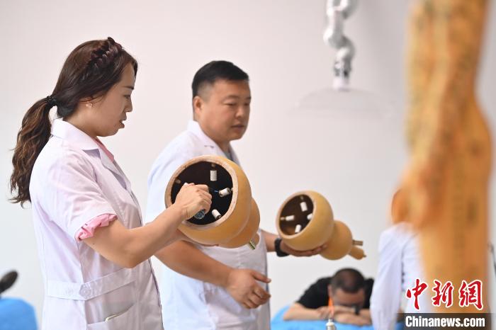 7月16日,甘肅省平?jīng)鍪徐`臺縣皇甫謐針灸康養(yǎng)館內(nèi),工作人員對患者進行葫蘆灸治療。中新社記者 李亞龍 攝