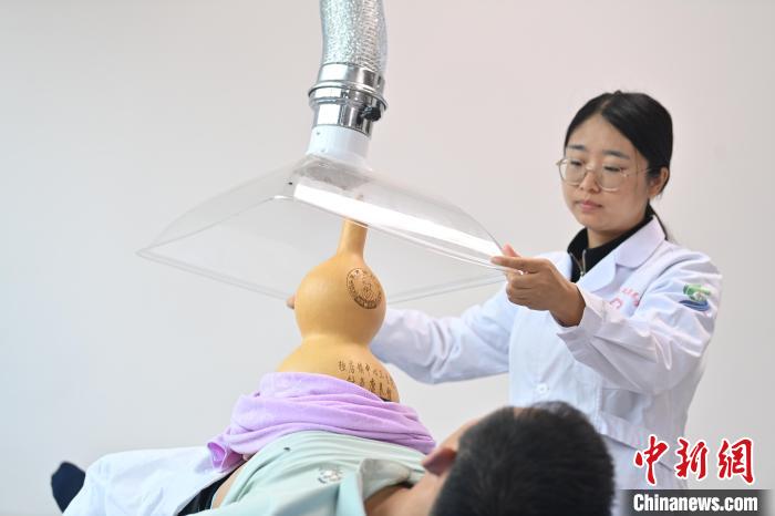 7月16日,甘肅省平?jīng)鍪徐`臺縣皇甫謐針灸康養(yǎng)館內(nèi),工作人員對患者進行葫蘆灸治療。2006年,靈臺皇甫謐針灸術(shù)入選第一批甘肅省非物質(zhì)文化遺產(chǎn)名錄。靈臺作為皇甫謐故里,當?shù)孛癖姺浅UJ可中醫(yī)康養(yǎng),針灸、拔火罐、推拿、葫蘆灸、火龍灸(督脈灸)等中醫(yī)特色療法受到了很多人的青睞,當?shù)毓俜揭餐ㄟ^舉辦大型節(jié)會等助推中醫(yī)康養(yǎng)產(chǎn)業(yè)發(fā)展。 皇甫謐是針灸醫(yī)學(xué)鼻祖,其《針灸甲乙經(jīng)》已在多個國家被廣泛傳播應(yīng)用。中新社記者 李亞龍 攝
