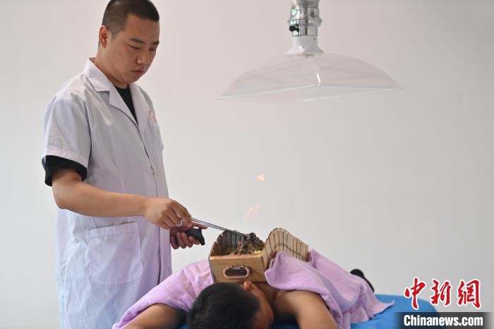 7月16日,甘肅省平?jīng)鍪徐`臺縣皇甫謐針灸康養(yǎng)館內(nèi),工作人員對患者進行火龍灸治療。2006年,靈臺皇甫謐針灸術(shù)入選第一批甘肅省非物質(zhì)文化遺產(chǎn)名錄。靈臺作為皇甫謐故里,當?shù)孛癖姺浅UJ可中醫(yī)康養(yǎng),針灸、拔火罐、推拿、葫蘆灸、火龍灸(督脈灸)等中醫(yī)特色療法受到了很多人的青睞,當?shù)毓俜揭餐ㄟ^舉辦大型節(jié)會等助推中醫(yī)康養(yǎng)產(chǎn)業(yè)發(fā)展。 皇甫謐是針灸醫(yī)學(xué)鼻祖,其《針灸甲乙經(jīng)》已在多個國家被廣泛傳播應(yīng)用。中新社記者 李亞龍 攝