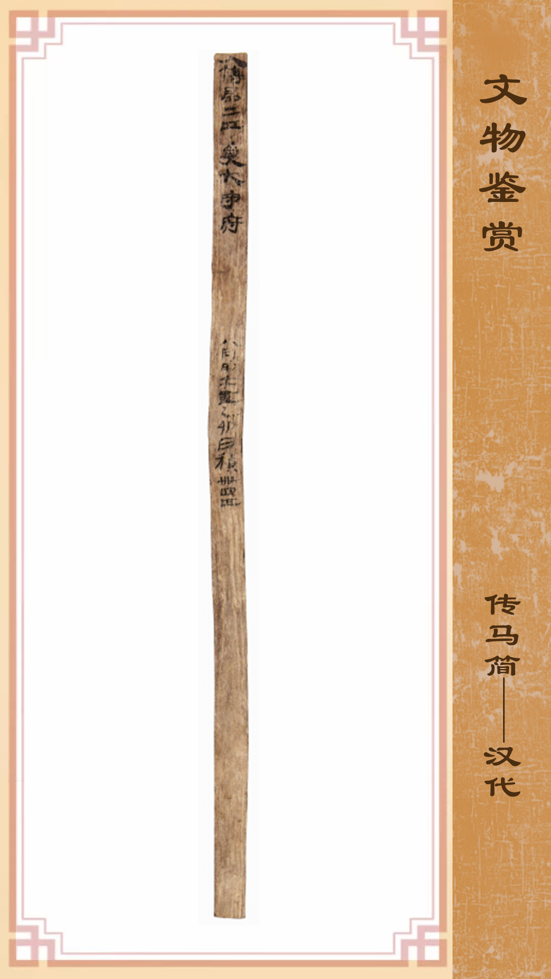 此簡1990年出土于敦煌懸泉置遺址,長23.4厘米、寬0.9厘米、厚0.3厘米,上下完整,紅柳材質。