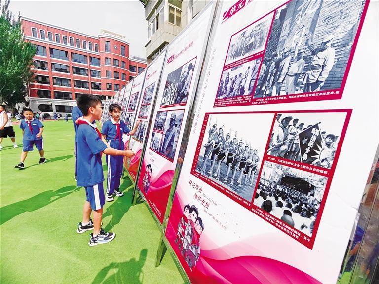 活動現(xiàn)場,該館講解員給孩子們講述了《抗戰(zhàn)烽火中的少年兒童》及《英雄血灑黃河畔——叢德滋》紅色故事。之后,蘭州市口琴藝術(shù)交流學會的成員現(xiàn)場演奏了《沒有共產(chǎn)黨就沒有新中國》《游擊隊之歌》《中國少年先鋒隊隊歌》等經(jīng)典紅色曲目。圖為學生觀看展板。