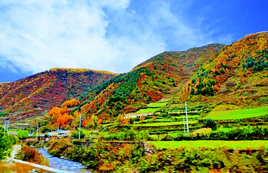秋日的渭川大地,以非凡的姿態(tài)喚醒最美的山川河流,繪就一幅又一幅的秋日七彩山水畫(huà)卷。秋景中的龍臺(tái)鎮(zhèn),就是畫(huà)卷中最美的詩(shī)和遠(yuǎn)方。秋葉隨風(fēng)搖曳,村落掩映群林,溪水潺潺遠(yuǎn)去,炊煙裊裊升起。在馬年云梯之上遙望太皇山巍峨雄壯,重巒疊嶂。由深紅、金黃、橙紅、翠綠交織在一起的秋日勝景,與藍(lán)天白云相映成趣,顯得壯麗無(wú)比。