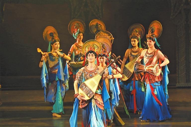 在大型洞窟沉浸式體驗劇《樂動敦煌》劇場,樂揚舞起。借助洞窟式實景移動舞臺和全息投影等高科技手段,使游人如置身于敦煌壁畫中的樂舞盛景一般。上海游客羅熙文說:“服飾華美,音樂旋律優(yōu)美,整場演出非常精彩,令人陶醉。”