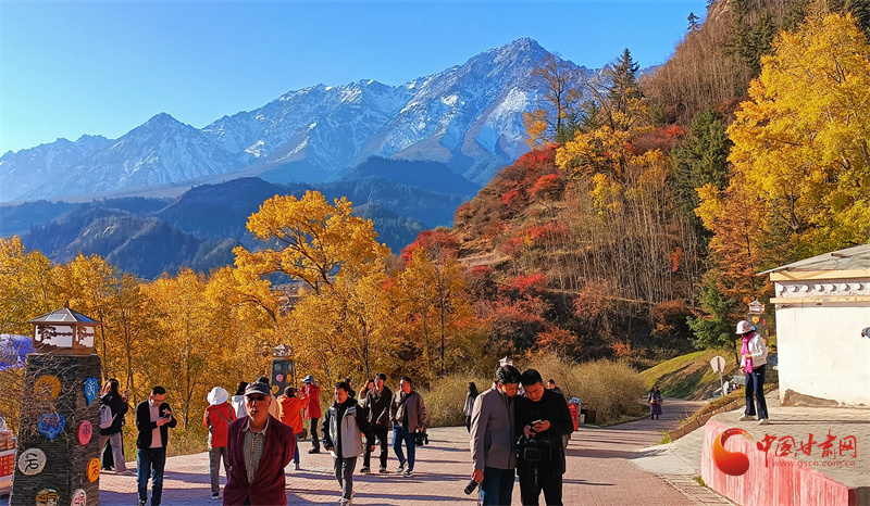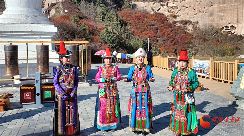 雪山之下,層林盡染,秋日的馬蹄寺美不勝收,裕固歌聲從北寺傳來(lái),身著裕固服飾的歌者為游客帶來(lái)最炫民族風(fēng)。