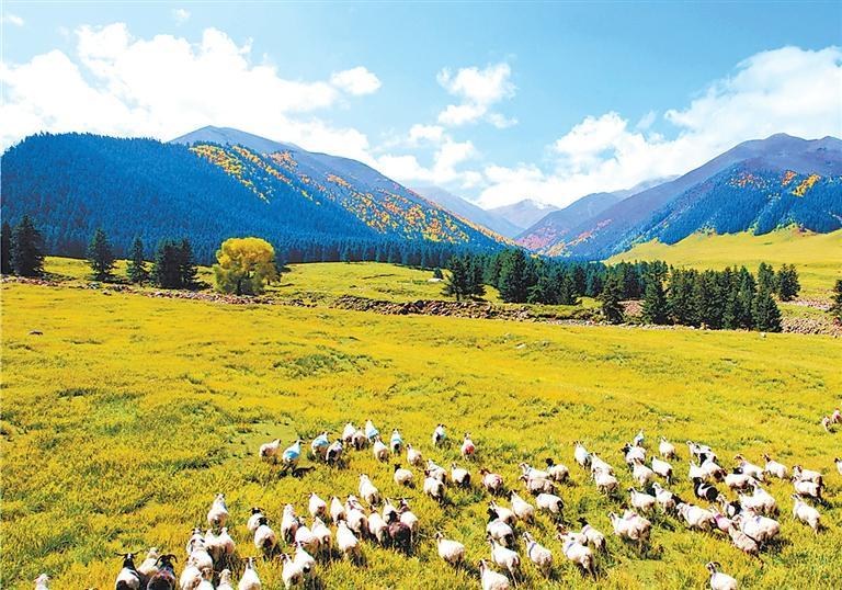 走進(jìn)景區(qū),映入眼簾的便是布爾智峽谷,其重巒疊嶂,造型奇特。進(jìn)入峽谷,豁然中開,地勢(shì)平坦,視野開闊,形成五山匯集的盆地景觀,一條悠悠的小河穿過盆地的胸膛,明亮清澈。遠(yuǎn)山白雪皚皚,山腰云杉參天,山下灌木叢生,蒼翠蔥郁,山底蒼蒼茫茫的草原上,不時(shí)涌動(dòng)著潔白的羊群。徜徉于廣袤的草原,便真正體味到“鳥的世界,花的海洋”的博大內(nèi)涵。