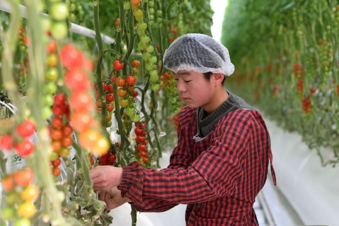 在古浪縣黃花灘生態(tài)移民區(qū)富民新村現(xiàn)代化智能玻璃溫室,村民在管護(hù)番茄 范培珅 攝