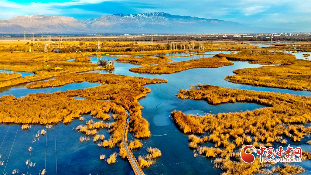 12月1日,俯瞰甘肅張掖國(guó)家濕地公園,夕陽(yáng)余暉映照,金色茂密的蘆葦隨風(fēng)搖曳,蘆花翩翩起舞,碧波蕩漾的水面逐漸凝結(jié)成冰,整個(gè)濕地化作一片金色的童話(huà)仙境,令人陶醉于無(wú)盡的遐想之中。