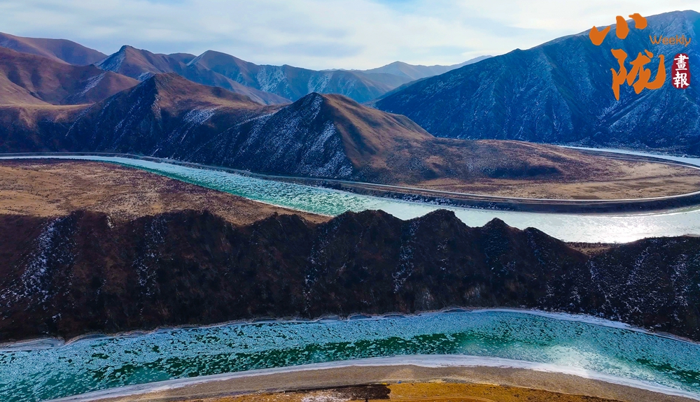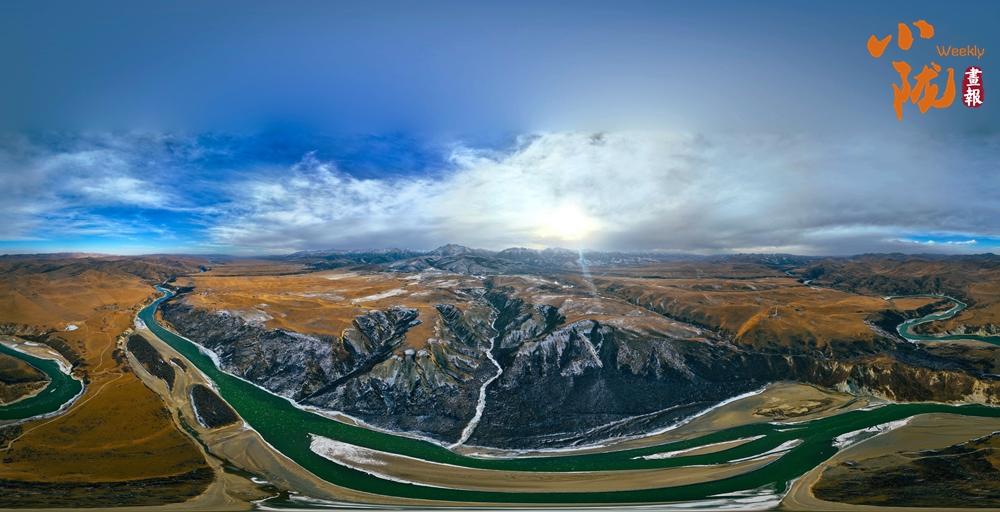 白雪皚皚的山梁、斗折蛇行的黃河,在陽光下閃耀著金色的光芒,顯得格外耀眼和溫暖。