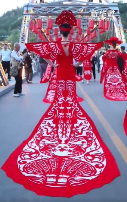 慶陽(yáng)剪紙?jiān)从谏?、講究情趣,是勞動(dòng)人民生產(chǎn)生活、情感氣質(zhì)、觀念習(xí)俗和文化傳承的結(jié)晶。著名民俗學(xué)家靳之林先生稱剪紙藝人是“真正的藝術(shù)家”。1986年,中央美術(shù)學(xué)院邀請(qǐng)鎮(zhèn)原縣民間美術(shù)大師祁秀梅赴北京進(jìn)行民間美術(shù)教學(xué)交流,向大學(xué)生演示民間剪紙。法國(guó)、日本、澳大利亞等國(guó)家的藝術(shù)家也多次專(zhuān)程到隴東考察民間剪紙藝術(shù)。慶陽(yáng)剪紙已由鄉(xiāng)村婦女手中的小玩意,堂而皇之地步入了國(guó)家藝術(shù)殿堂——中國(guó)民間美術(shù)館,并在日、意、澳等國(guó)家展覽亮相。圖為身著慶陽(yáng)剪紙服裝的模特們行走在蘭州中山橋上,驚艷了來(lái)往的游客。