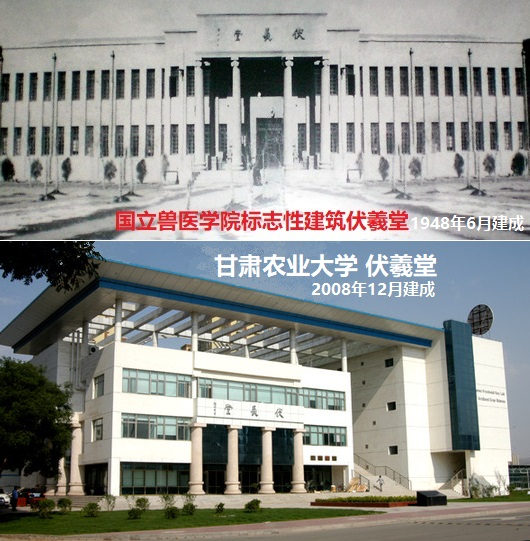 1946年10月國(guó)立獸醫(yī)學(xué)院成立后,于1948年6月建成了當(dāng)年蘭州最雄偉壯觀的建筑——伏羲堂。有深厚國(guó)學(xué)功底的校長(zhǎng)盛彤笙,為紀(jì)念人文始祖伏羲氏在認(rèn)識(shí)自然、適應(yīng)自然、改造自然和發(fā)展生產(chǎn)生活的過(guò)程中,所進(jìn)行的一系列造福人類(lèi)的發(fā)明創(chuàng)造,將這幢教學(xué)大樓命名為“伏羲堂”,并親自撰寫(xiě)了一篇銘文《伏羲堂記》,“用追前烈,以志建堂之艱難”。