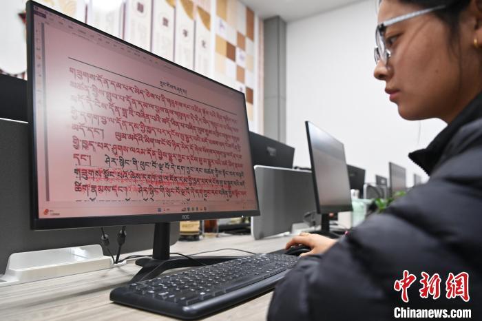 2月27日,在甘肅甘南藏族自治州碌曲縣益西達吉科技有限公司內(nèi),工作人員正在進行藏文古籍數(shù)字化相關(guān)工作。該公司主要從事民族古籍數(shù)字化建設(shè)和古籍文獻數(shù)據(jù)庫建設(shè),自2019年以來,承擔西藏、四川、甘肅等省區(qū)的藏文古籍數(shù)字化項目。圖為工作人員用該公司研發(fā)的藏文信息處理系統(tǒng)對古籍數(shù)字化內(nèi)容進行檢查。中新社記者 九美旦增 攝