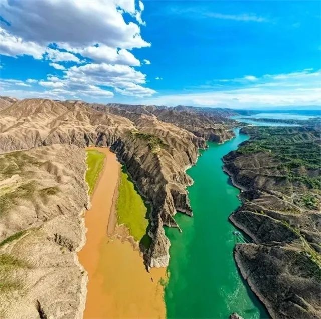 在永靖縣劉家峽大壩附近,黃河與洮河以“Y”字形交匯,形成了“黃洮交匯”的奇觀。黃河水清澈碧藍(lán),而洮河則因攜帶大量泥沙呈現(xiàn)渾濁的黃色,兩者相遇卻不相融,形成了一條鮮明的分界線,宛如一幅天然的“鴛鴦鍋”畫卷。