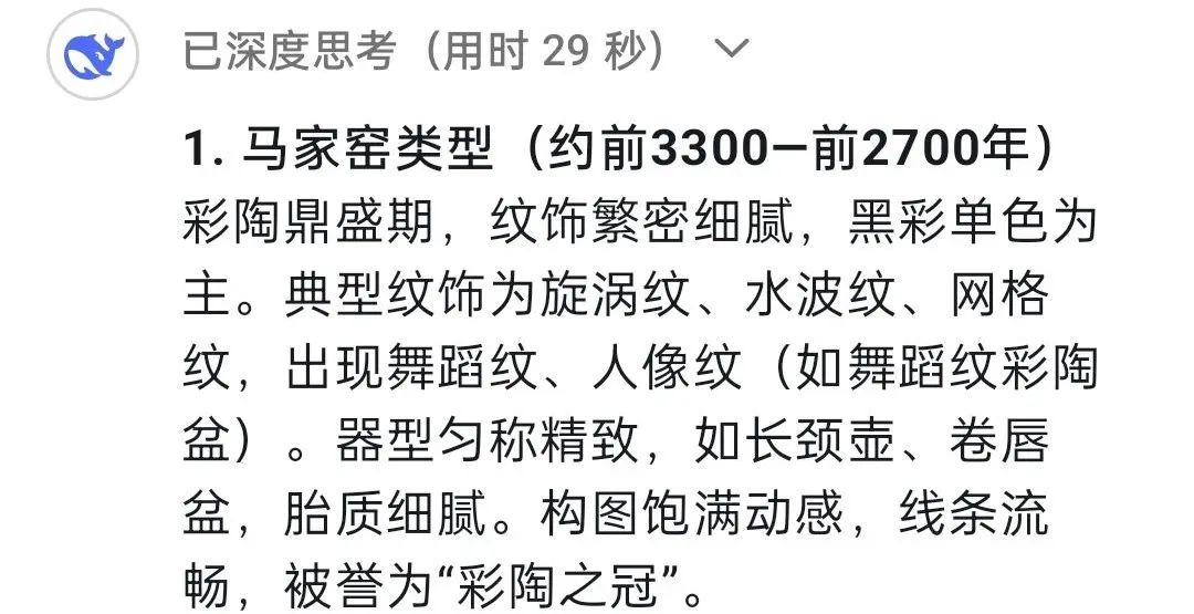 DeepSeek:馬家窯文化作為人類文明長(zhǎng)河中一顆璀璨的明珠,因最早發(fā)現(xiàn)于甘肅省臨洮縣馬家窯村而得名,它被認(rèn)為是仰韶文化向西發(fā)展的延續(xù),它展現(xiàn)了黃河上游先民的創(chuàng)造力,更是史前人類與自然對(duì)話、與社會(huì)共生的見證。
