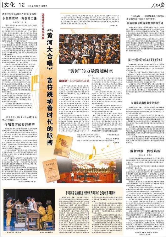 6月30日晚,北京音樂廳內(nèi),京津冀藝術(shù)家會(huì)聚一堂,奏響交響音樂會(huì)《黃河》;不久前,廣東深圳8個(gè)合唱團(tuán)、300余名歌者共同演唱《黃河大合唱》,吸引近120萬網(wǎng)友線上觀演……80多年來,從烽火硝煙中誕生的《黃河大合唱》成為跨越時(shí)空的回響,承載著中華兒女的共同記憶。從主題展覽到各類演出,《黃河大合唱》的每個(gè)音符都跳動(dòng)著時(shí)代的脈搏,讓我們重溫這首抗戰(zhàn)歌曲,感受經(jīng)典作品傳承的永恒力量。