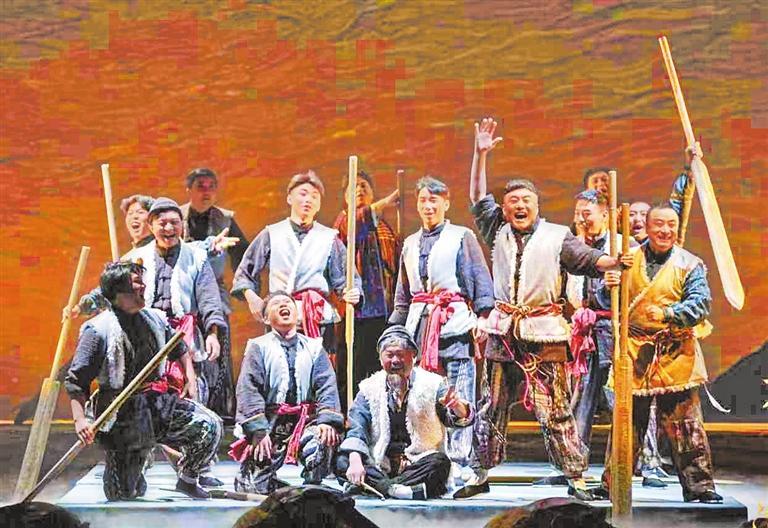 《大河東流》的題材構成呈現(xiàn)出鮮明的復合型特征,其核心在于將黃河文化、甘肅地域特色、抗戰(zhàn)歷史與家族倫理熔鑄為一體。劇中,黃河既是地理坐標,更是文化符號。從開場的“黃河號子”到貫穿全劇的羊皮筏子,從金城關、黃河鐵橋的舞臺化呈現(xiàn)到地游子步、風擺柳等隴劇特有的身段程式,黃河的自然景觀與人文精神被轉化為舞臺符號。