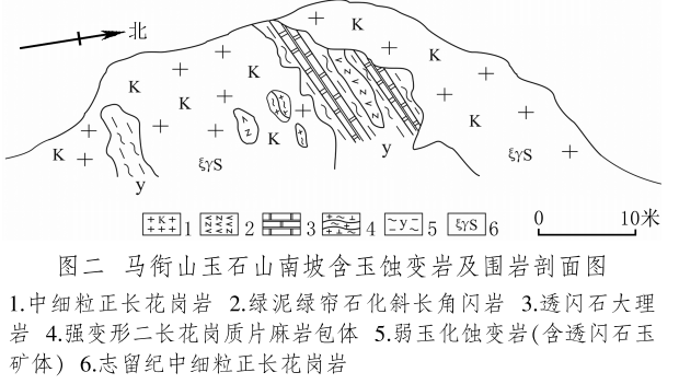 馬銜山玉礦分布在馬銜山東南部的玉石山(圖版一),海拔3028米。山上出露的地質(zhì)體主要為古元古界馬銜山巖群、中元古代片麻二長花崗質(zhì)巖[3]和志留紀(jì)正長花崗巖及正長巖。馬銜山巖群的巖性為黑云斜長片麻巖、變粒巖、斜長角閃巖和白云質(zhì)大理巖,巖石普遍遭受了韌性變形,變余糜稜巖發(fā)育。志留紀(jì)巖漿侵入期后熱液活動(dòng)較強(qiáng),石英脈細(xì)脈發(fā)育,局部見螢石礦化或礦床[4]。玉礦化主要產(chǎn)于馬銜山巖群與志留紀(jì)正長花崗巖和正長巖接觸帶上(圖版二),具體賦存在與白云質(zhì)大理巖的接觸部位,是正長花崗巖及正長巖與鎂質(zhì)大理巖接觸交代蝕變的產(chǎn)物[5]?;◢弾r與片麻巖、變粒巖和斜長角閃巖接觸界線附近巖石雖有蝕變,但不見玉化蝕變巖或玉石出露。在近山頂開采玉石揭露的一個(gè)地質(zhì)剖面清晰地顯示了這些特征(圖二)。該剖面大致呈東西走向,長約50米,馬銜山巖群多呈殘留體出露,斜長角閃巖綠泥綠簾石化強(qiáng)烈,大理巖普遍發(fā)生蝕變,形成透輝透閃石大理巖,緊靠花崗巖接觸地帶發(fā)育窄窄的透閃石玉礦帶。現(xiàn)在人們找玉,也主要在該剖面上的花崗巖和鎂質(zhì)大理巖的接觸帶上鑿洞,在接觸帶上見有多處采挖玉石的洞穴。在該剖面西側(cè)約50米,發(fā)育有正長巖與大理巖的混染帶,肉紅色正長巖中包裹混染著大量灰綠色透閃透輝大理巖,部分已蝕變?yōu)橥搁W透輝石巖,且質(zhì)地較細(xì)膩,成為半玉化巖石。剖面和周圍地質(zhì)特征表明,玉礦的形成是早古生代志留紀(jì)花崗質(zhì)雜巖體侵入到古元古代鎂質(zhì)大理巖,發(fā)生接觸交代蝕變作用的結(jié)果,在兩種巖石接觸帶形成玉礦體。但并不是蝕變帶中的巖石都是透閃石玉石,透閃石玉在蝕變帶中多呈雞窩狀或不規(guī)則狀分布,少量呈脈狀出露。從剖面及部分采坑的規(guī)模來看,玉礦體向深處有變大、變好的趨勢,這主要受控于接觸面產(chǎn)狀,在傾角較緩處礦體相對(duì)較大。橫向上在背離接觸面方向圍巖具有從透閃石玉到透閃透輝石玉、透閃透輝石大理巖再到含透閃石大理巖的變化特征,反映了交代蝕變強(qiáng)度與接觸帶溫度及熱液成分變化的密切關(guān)系。從玉礦體到蝕變圍巖由于成分和結(jié)構(gòu)的變化出現(xiàn)一系列不同類型的玉石或巖石。我們?cè)谄拭嫔喜杉揭恍┬K的淡綠色玉料(圖版三)和出露較寬的微晶大理巖,經(jīng)偏光顯微鏡下薄片鑒定和XRF檢測,確定有透閃石玉、透輝透閃玉、透閃透輝石玉、透閃透輝石大理巖和含透閃石大理巖等,這與馬家窯遺址出土的齊家文化時(shí)期大部分玉質(zhì)品玉料類型基本一致[6]。部分地段近礦圍巖還有透輝石巖、透輝矽卡巖、矽卡巖化大理巖、蛇紋石化大理巖、斜長透輝石巖等。玉石山的采洞(坑)由于資源與環(huán)境保護(hù)的要求,大多已被填埋,但仍可見采坑殘留的位置。采洞(坑)均位于大理巖與正長花崗巖接觸帶靠近大理巖一側(cè),這也間接顯示了玉礦體的位置。此外,玉石山花崗巖中石英細(xì)脈較發(fā)育,局部可見螢石礦化,反映了花崗巖侵入期后低溫?zé)嵋夯顒?dòng)仍較強(qiáng),對(duì)玉礦也有一定的改造影響。