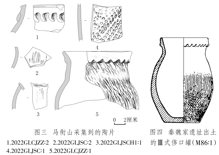 陶片 2片,2022GLCJZZ∶1,罐殘片,夾砂紅陶,腹部以下缺失。侈口,上有煙熏痕跡。短頸,頸上部有一圈鋸齒狀凸飾,鼓腹,頸部和腹部滿飾粗繩紋。復(fù)原口徑12、器壁厚0.6~1、殘高10厘米(圖三,5)。與秦魏家遺址出土的齊家文化Ⅲ式侈口罐(圖四)[16]形制相似。2022GLCJZZ∶2,罐口沿殘片,夾砂紅陶??谘叵掠性卵罓罡郊佣鸭y??谘貧堥L5.3、殘高4.8、厚0.7厘米(圖三,1)。