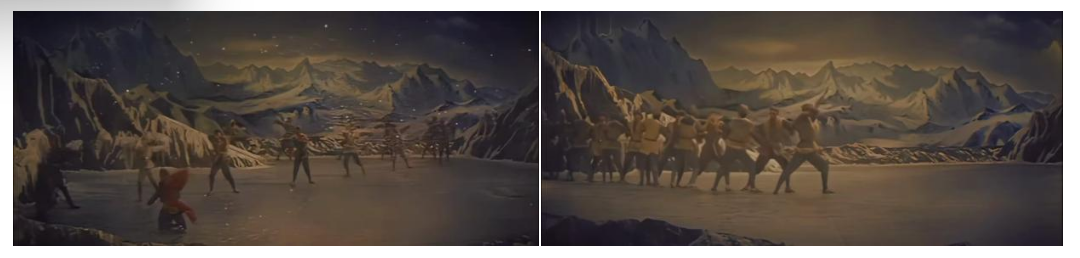 在表現(xiàn)行軍征程時,舞者以身體前傾的大跨步姿態(tài),沿群山布景走出巨大的“S”型曲線。這不是簡單的隊形變換,它首先在視覺上營造出千軍萬馬綿延不絕的雄渾意象。同時,“S”形曲線本身藝術(shù)化地傳達(dá)了“道路是曲折的,前途是光明的”這一革命哲理。舞者整齊劃一、重心下沉的堅定步伐,與沙幕光影營造出的風(fēng)沙漫天效果相結(jié)合,共同體現(xiàn)紅軍在艱難險阻中依然定向不移的鋼鐵意志。
